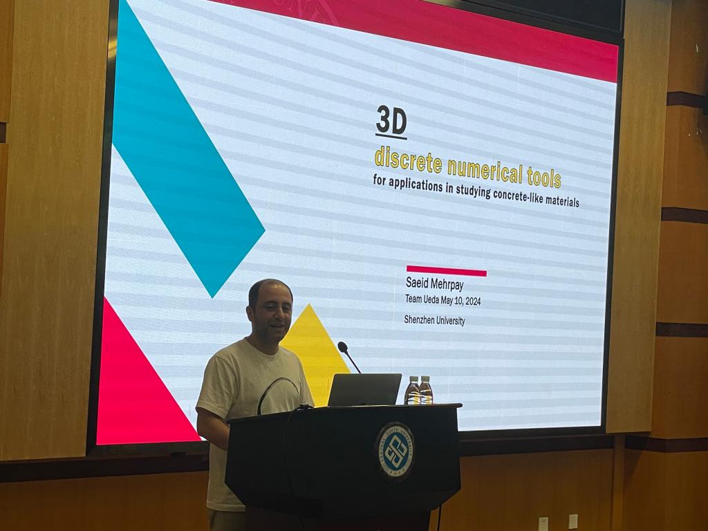 报告分为两场,在第一场报告中,UEDA教授介绍了课题组二十多年来在离散元-刚体弹簧模型(RBSM)细观模拟混凝土和混凝土结构方面的研究进展。首先,UEDA教授阐述了对混凝土损伤开展多尺度(微观、细观和宏观)分析的必要,其中细观分析可有效搭建起材料微观损伤原理和宏观失效行为间的桥梁。接着,UEDA教授介绍了应用RBSM对混凝土进行细观模拟分析的基本策略,采用文献综述的形式,介绍了RBSM在细观模拟分析混凝土受力学(静态、持续和循环加载)和环境(冻害、氯离子侵蚀等)因素作用下的本构模型以及模拟结果,展现了RBSM在模拟预测混凝土内部细观变形及开裂演化上的潜力。