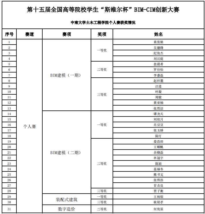5月11-12日,第十五届全国高等院校学生“斯维尔杯”BIM-CIM创新大赛总决赛在湖南省长沙市举行,新葡的京集团35222vip在团队赛中斩获本科组正向一体化BIM、CIM应用赛项冠军及一等奖2项,在个人赛中共获得一等奖10项、二等奖13项、三等奖8项。