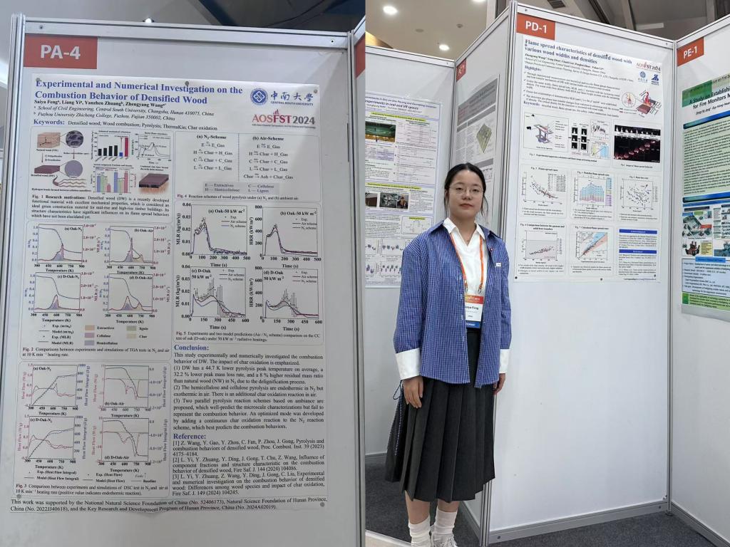 会议期间,中南大学消防工程系共展出4张海报,涵盖了固体火蔓延、致密木材的阻燃性能模拟、致密木材的开裂研究、火灾风险识别算法4个不同的主题,硕士生冯赛亚在场为国内外研究人员讲解展示。