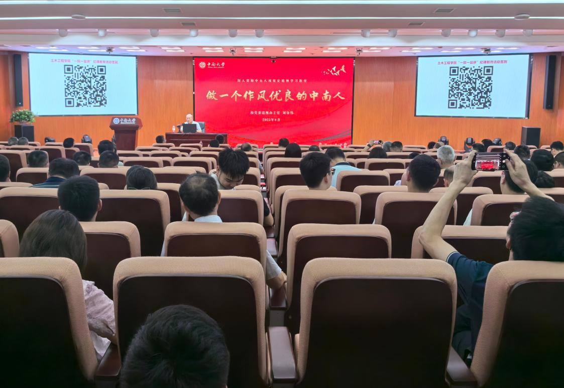 6月18日下午,新葡的京集团35222vip在天心校区梅园报告厅开展“一院一宣讲”纪律教育专题活动。校党委巡视办主任刘奇伟以“做一个作风优良的中南人”为主题进行宣讲,旨在深入学习贯彻中央八项规定精神,教育引导教职工严守纪律规矩,筑牢廉洁防线。会议由学院党委书记李磊主持,学院全体教职工参加。