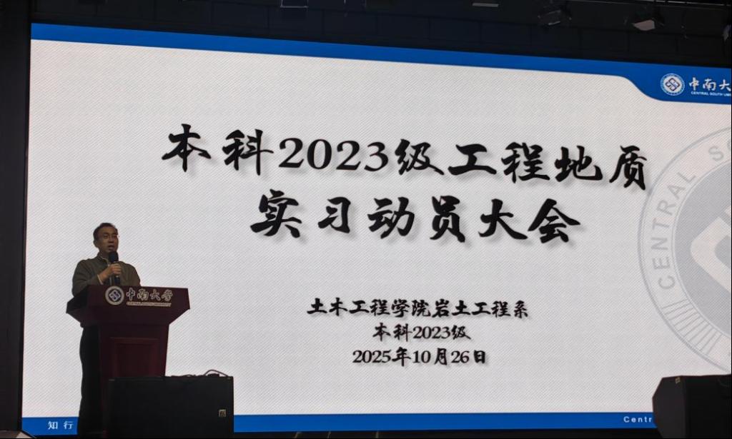 10月26日下午,新葡的京集团35222vip本科2023级工程地质实习动员大会在铁道学院大礼堂顺利举行。岩土工程系主任陈晓斌教授出席,地质实习带队教师、本科2023级辅导员、400余名学生参与,会议由本科2023级辅导员潘文彬主持。