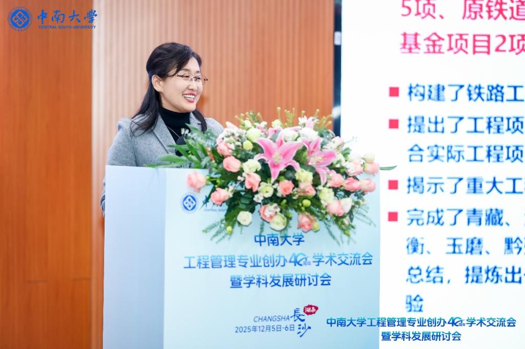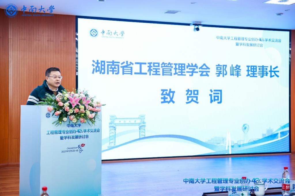 湖南省工程管理学会郭峰理事长到会并致贺词。他表示,中南大学是湖南省工程管理学会的理事长单位,中南大学工程管理专业以卓越的学科实力、深厚的育人情怀,成为我国工程管理领域的标杆与典范,同时也奠定了湖南省工程管理学会的成长根基。他表示,在中南大学工程管理专业的积极支持下,湖南省工程管理学会在组织建设、学术引领、人才培养与举荐及行业服务等方面取得了优异成绩。他希望中南大学工程管理专业未来能够继续引领学科发展潮流,培育更多行业栋梁,产出更多科技成果。