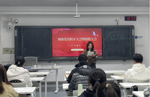 会议伊始,全体人员起立奏唱国歌。会议严格按照组织发展程序进行,第一环节,王喆等4位预备党员按序上场进行汇报,向党组织如实汇报其于预备党员期间在思想、学习和生活等方面的情况,表达了加入中国共产党志愿和决心。与会党员充分发表意见,学生第一党支部全体与会正式党员进行投票表决,一致通过王喆等4位预备党员如期转为正式党员。