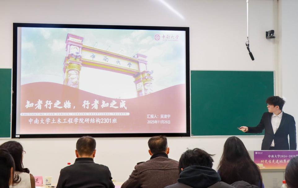 研结构2301班坚持以党建引领为核心,学术发展与志愿服务协同推进,构建出凝聚力强、充满活力的班集体。班级科研氛围浓厚,成果丰硕,已发表12篇论文,专利5项,研究聚焦高性能混凝土、装配式节点抗震等。班级成员积极在各级党团组织、研究生会中发挥骨干作用,策划多项品牌活动。常态化开展志愿服务,并组织岳麓山攀登、韶山廉政教育等特色活动,参与学院十强团日活动创新大赛荣获三等奖。全体同学将继续秉持“团结、严谨、求实、创新”的班风,砥砺前行,为学院发展与强国建设贡献青春力量。