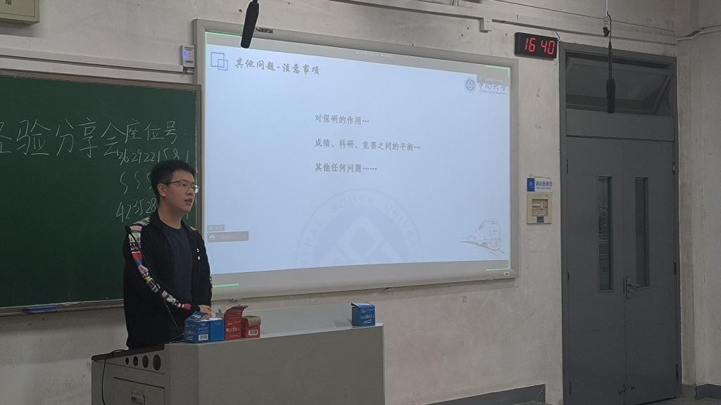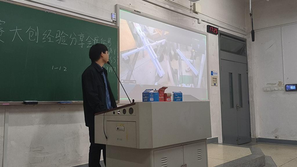 在大二会场,会议伊始,由叶芳达学长介绍竞赛经验。主讲互联网+比赛,学长从个人竞赛经历,竞赛简要介绍和参赛建议以及其他问题和注意事项等几个方面展开。每一方面都有叶学长独到的见解和形象的阐述,同学们听完之后获益匪浅。会议中间休息之余也有小插曲,为了活跃会议的气氛,会议负责人通过抽签的顺序随机两名幸运观众送上特别礼物。接着是王超伟学长针对性的对于结构设计竞赛进行讲解。王学长在结构设计竞赛这方面获奖众多,经验丰富。内容从个人竞赛经历入手,其中包含了比赛现场图片,参赛作品图片和作品加载视频,让听众切身体验到竞赛过程。最后由韩相成学长采用线上讲述的方式为我们介绍学科竞赛方面的问题。其中介绍了各类学科竞赛,分析了各类学科竞赛的权重,表明了韩学长对于不同类竞赛的立场与看法,在思想方面纠正了同学们对学科竞赛的理解偏差。