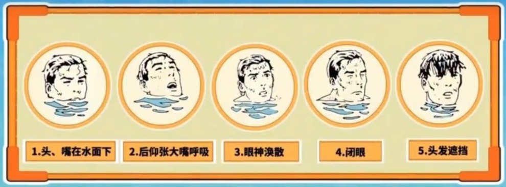 电影里,一个人溺水时会在水里慌乱地拍打水花、挥手示意或者大喊“救命”等,其实这都是夸张了的。一个人溺水了,是喊不出来的,也无法挥舞手臂来示意,因为他们已经无法控制手臂的动作,躯干已经僵直。溺水的人通常有表现: