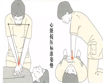 方法:首先确认按压位置是胸部两乳头连线的中点,两手重叠交叉,以掌根置于按压点,上臂垂直,腰部用力,每次按压要保证胸部下陷深度为5-6cm,频