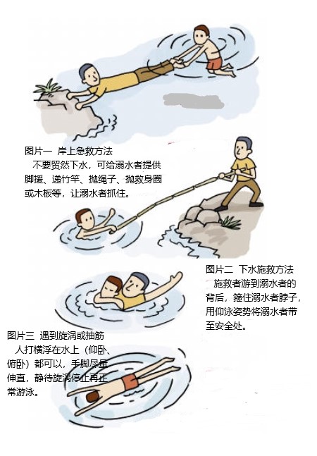 (4)谨慎下水。施救者若不熟水性或不了解现场水情,不应轻易下水,应呼救或报警。