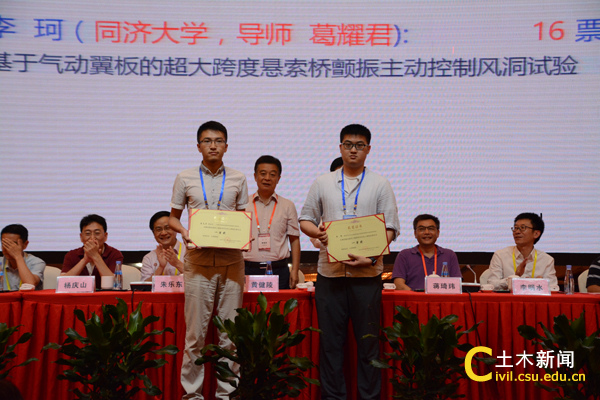 此次会议,共有500余名来自美国、日本及全国各地风工程研究领域的专家学者和研究生代表出席。其中出席第四届全国风工程研究生论坛的代表297名,来自国内36所高校或科研院所。两个会议参会代表最多的单位是同济大学,代表总数61名,其中教师代表15名、研究生代表46名;其次,是中南大学,代表总数44名,其中教师代表8名、研究生代表36名;第三,西南交通大学,代表总数39名,其中教师代表9名、研究生代表30名;代表人数20名以上的单位还有4个:湖南大学(代表总数33名,其中教师代表10名、研究生代表23名)、哈尔滨工业大学(代表总数26名,其中教师代表10名、研究生代表16名)、湖南科技大学(代表总数25名,其中教师代表8名、研究生代表17名)和石家庄铁道大学(代表总数21名,其中教师代表7名、研究生代表14名)等。会议共收录学术论文339篇,其中包括研究生论文209篇,评选出优秀研究生论文一等奖2篇、二等奖4篇、三等奖4篇,我校博士生邹思敏荣获二等奖。大会还邀请了日本东京工业大学田村哲朗教授(Prof. Tetsuro Tamura)、同济大学朱乐东教授、浙江大学楼文娟教授、西南交通大学李明水教授、石家庄铁道大学刘庆宽教授和湖南大学华旭刚教授等六位国内外著名风工程专家作了大会报告。