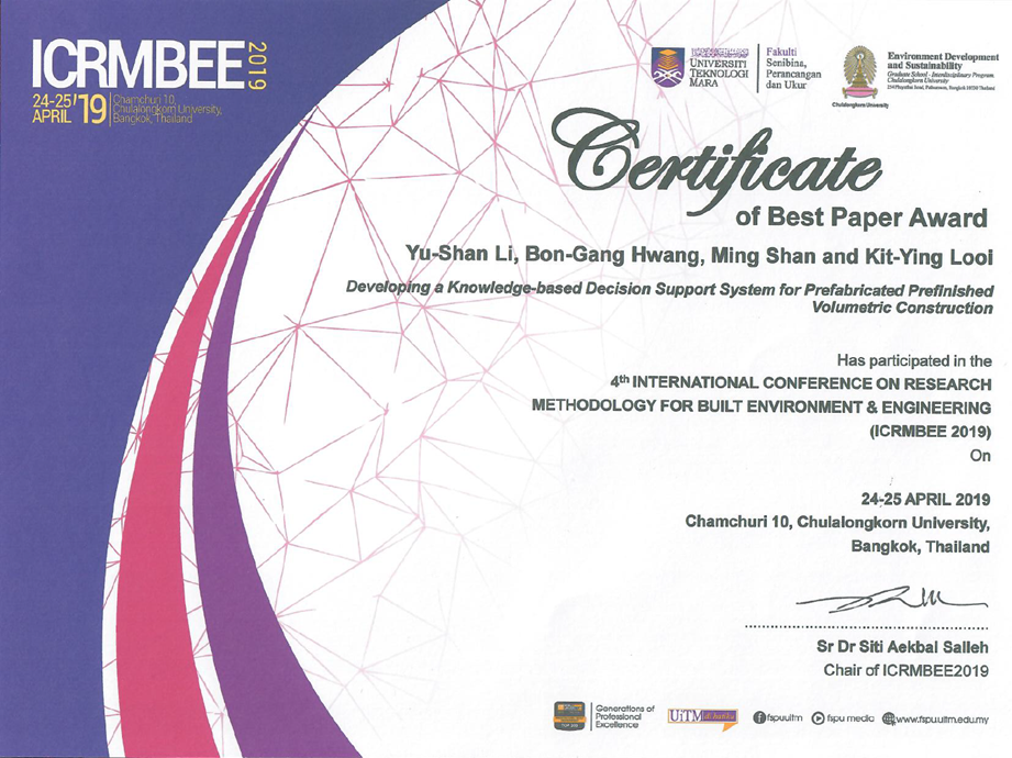2019年4月24日至25日,我系教师单明带领工程管理专业1502班刘稳鹊同学、土木国际1501班李玉珊同学前往泰国,参加由泰国朱拉隆功大学主办的“第四届建设环境与工程研究方法国际研讨会”(4thInternational Conference on Research Methodology for Built Environment & Engineering)。会议期间,单明老师受邀担任项目管理与建设工程管理分论坛(Session of Project Management and Construction)主席,刘稳鹊同学做了题为“Prefabricated Prefinished Volumetric Construction: Key Constraints and Mitigation Strategies”的报告,李玉珊同学做了题为“Development of Knowledge-based Decision Support System for Prefabricated Prefinished Volumetric construction Method”的报告。经过激烈竞逐,李玉珊同学的报告荣获大会最佳论文奖。刘稳鹊同学的报告同样获得了参会学者的积极好评。