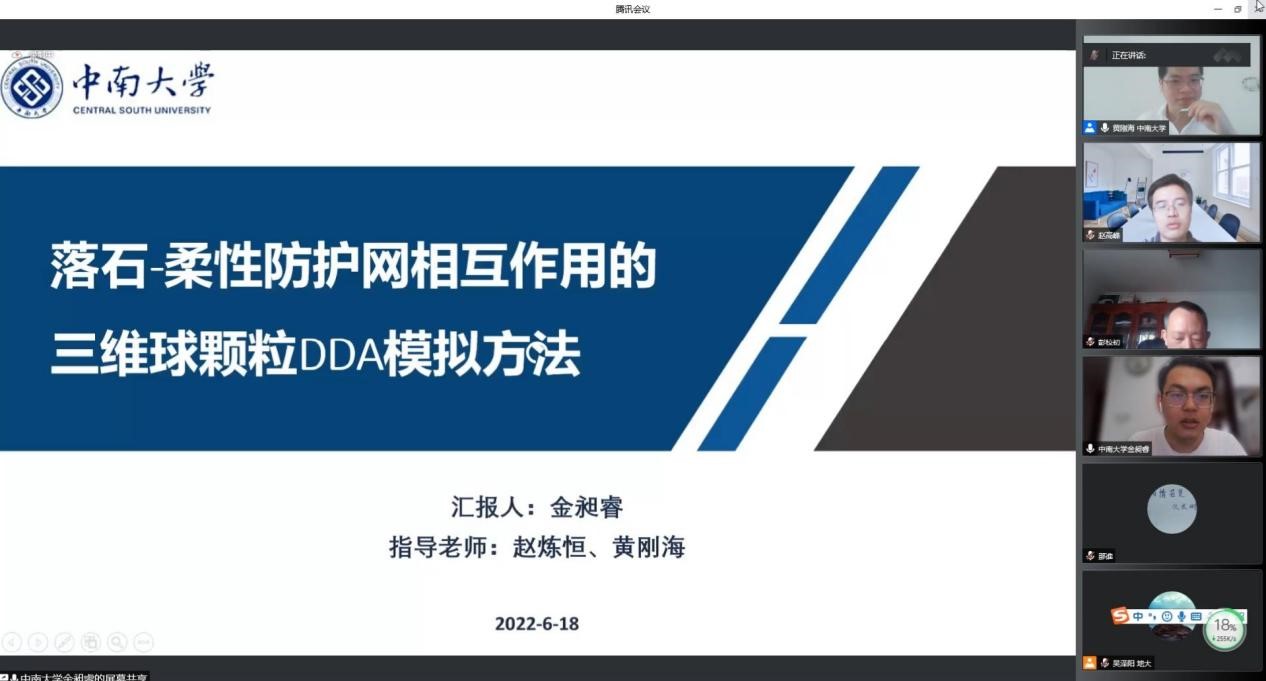 我院博士生金昶睿作题为《落石-柔性防护网相互作用的三维球颗粒DDA模拟方法》的报告