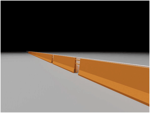模型有三层,第一层类似一个窄的刚性护栏。第二层设计则是护栏最重要的缓冲部分,可以填入一些类似的柔性材料。第三层的设计并无特殊,是一个完全固结在地面上的结构,作为第二层形变吸能的支撑,同时也是作为最后的一道防线,防止护栏被彻底冲破。左图为简画护栏断面图。