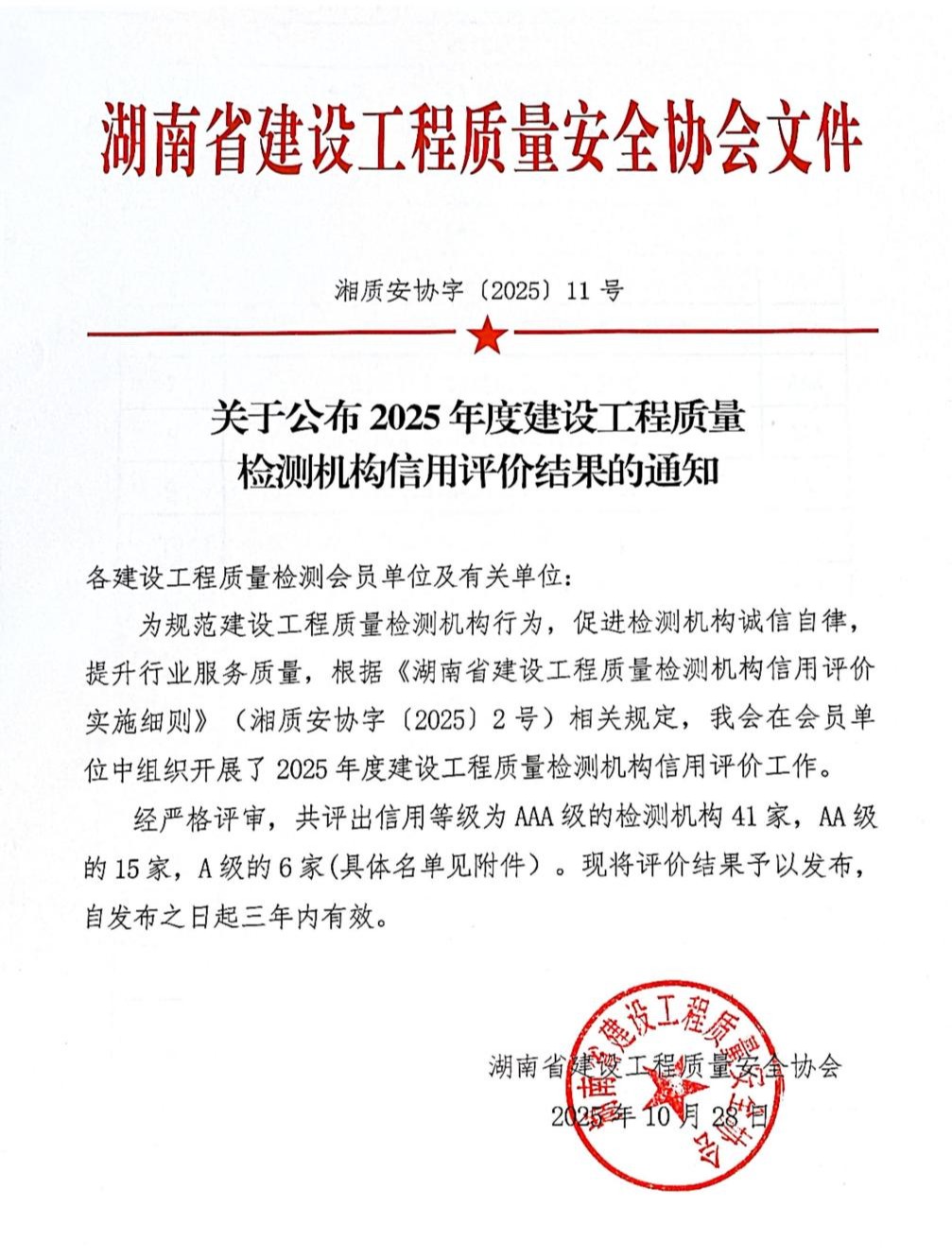 2025年10月28日,湖南省建设工程质量安全协会正式公布2025年度建设工程质量检测机构信用评价结果。湖南铁院土木工程检测有限公司凭借规范的管理体系、扎实的检测能力、良好的市场信誉与持续稳定的服务质量,成功获评“AAA级”信用评价,充分体现了公司在行业内的综合实力与良好形象。