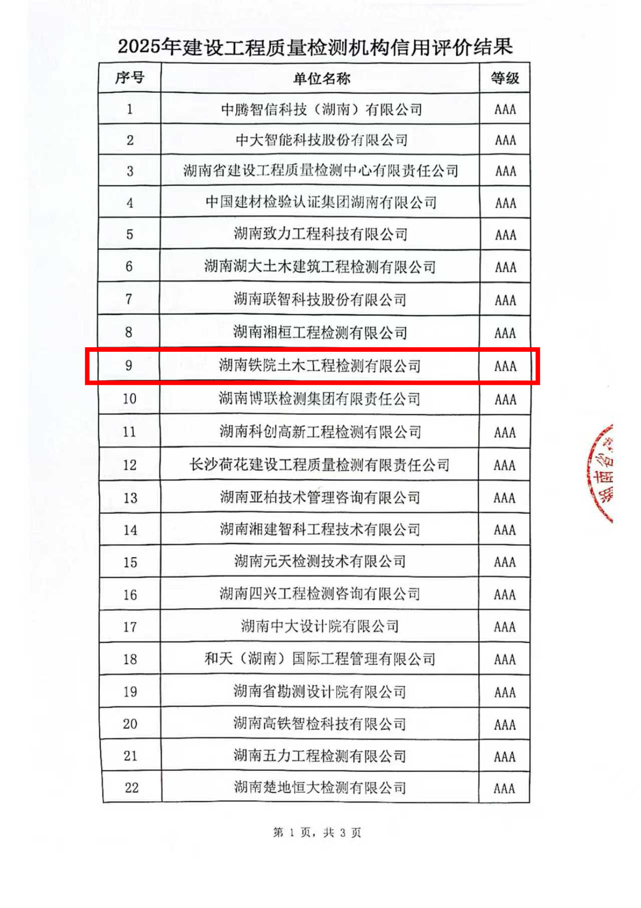 湖南铁院土木工程检测有限公司获评2025年度湖南省建设工程质量检测机构AAA级信用评价