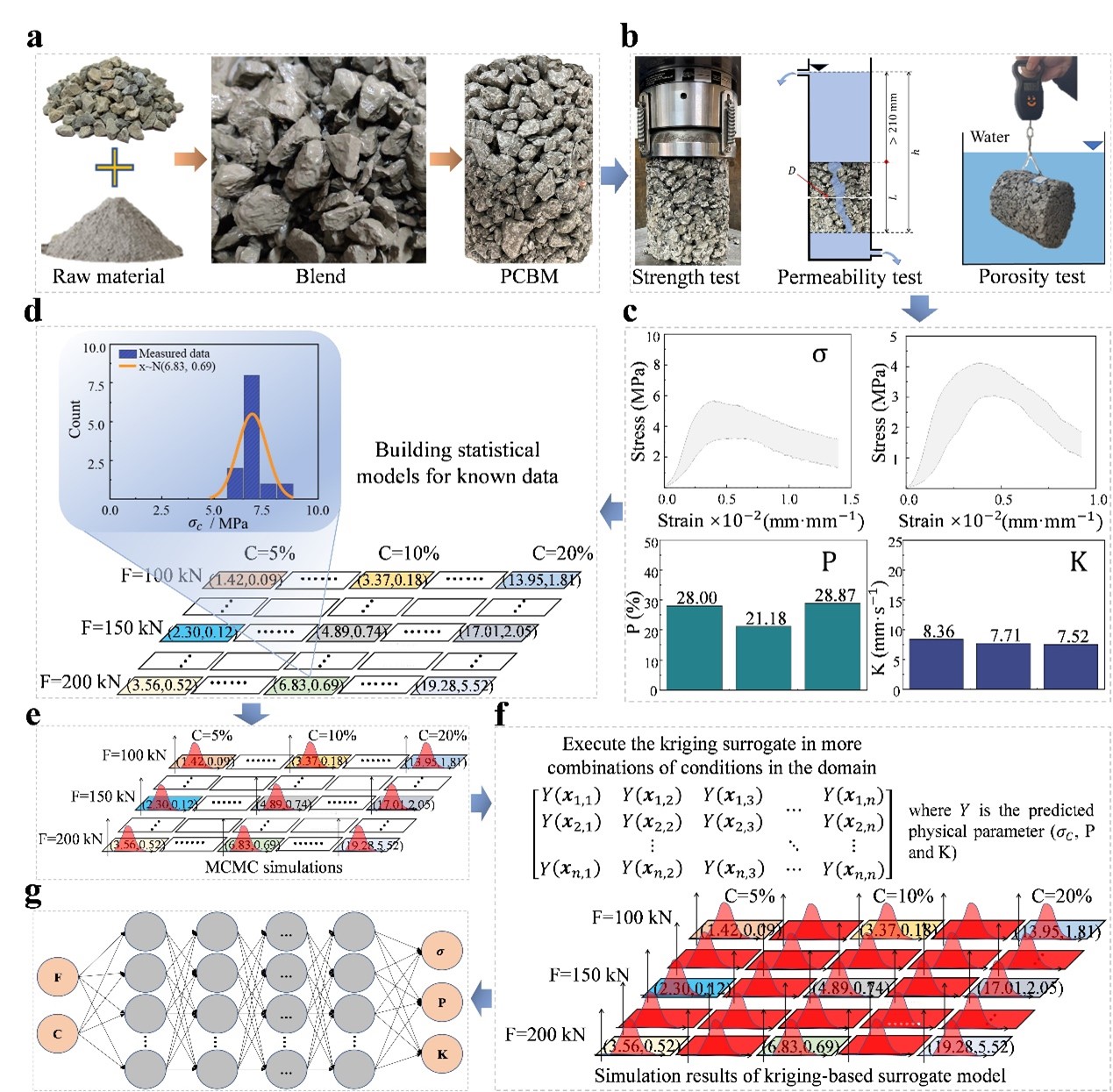 该研究针对有限的试验数据限制了对透水水泥稳定基层材料(PCBM)机械强度和渗透性的准确预测问题,提出了一种基于Kriging代理模型辅助的人工神经网络(KS-ANN)框架。该框架整合了实验室测试、数学建模和机器学习技术。研究团队首先利用有限的试验数据,通过马尔可夫链蒙特卡洛模拟和基于Kriging的代理模型相结合,建立了一个统计分布模型来丰富数据集。随后,使用这些数据训练了一个人工神经网络(ANN)模型。