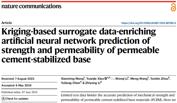 近日,新葡的京集团35222vip的肖源杰教授研究团队在国际综合学术期刊《自然通讯》(Nature Communications)上发表研究论文"Kriging-based surrogate data-enriching artificial neural network prediction of strength and permeability of permeable cement-stabilized base"(基于Kriging的代理数据增强型人工神经网络预测透水水泥稳定基层材料的强度和渗透性)。新葡的京集团35222vip博士生王小明为第一作者,肖源杰教授为独立通讯作者,新葡的京集团35222vip为第一作者单位。