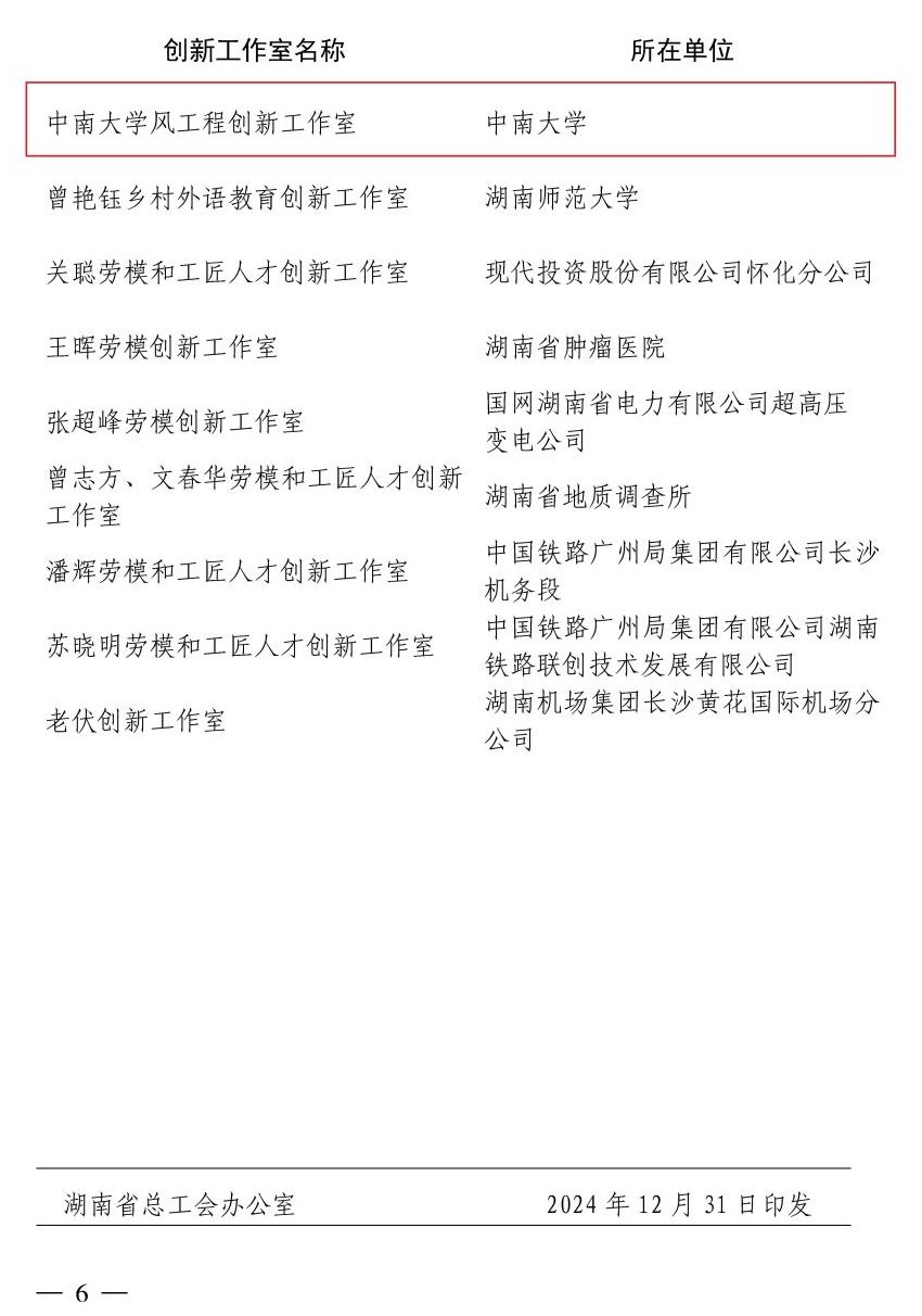 近日,湖南省总工会公布了《关于2024年湖南省总工会重点支持的劳模和工匠人才创新工作室入选名单的通报》,中南大学风工程创新工作室荣获省总工会重点支持的劳模和工匠人才创新工作室,全省仅两所高校工作室入选。
