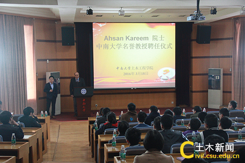 3月18日上午,美国工程院院士、国际风工程协会主席、美国Notre Dame大学土木环境工程和地质科学系Ahsan Kareem教授受聘为我校名誉教授,聘任仪式在铁道校区国际报告厅举行。中南大学副校长田红旗院士出席并为Ahsan Kareem教授颁发了聘书。美国纽约州立大学布法罗分校助理教授吴腾、校人事处副处长许毅,我院院长谢友均、院党委书记蒋琦玮、副院长盛兴旺、何旭辉、蒋丽忠参加了活动。近百名研究生和本科生聆听了报告。