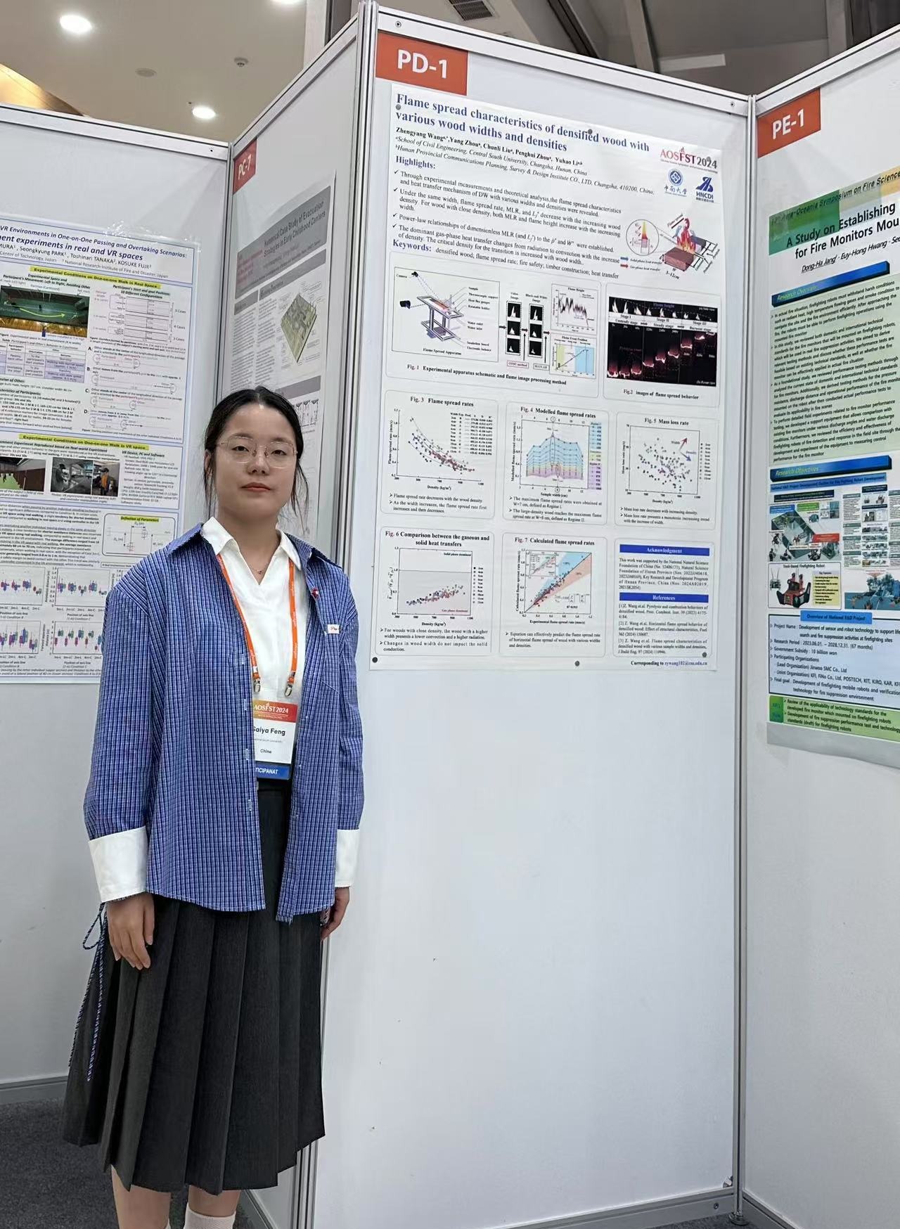 会议期间,中南大学消防工程系共展出4张海报,涵盖了固体火蔓延、致密木材的阻燃性能模拟、致密木材的开裂研究、火灾风险识别算法4个不同的主题,硕士生冯赛亚在场为国内外研究人员讲解展示。