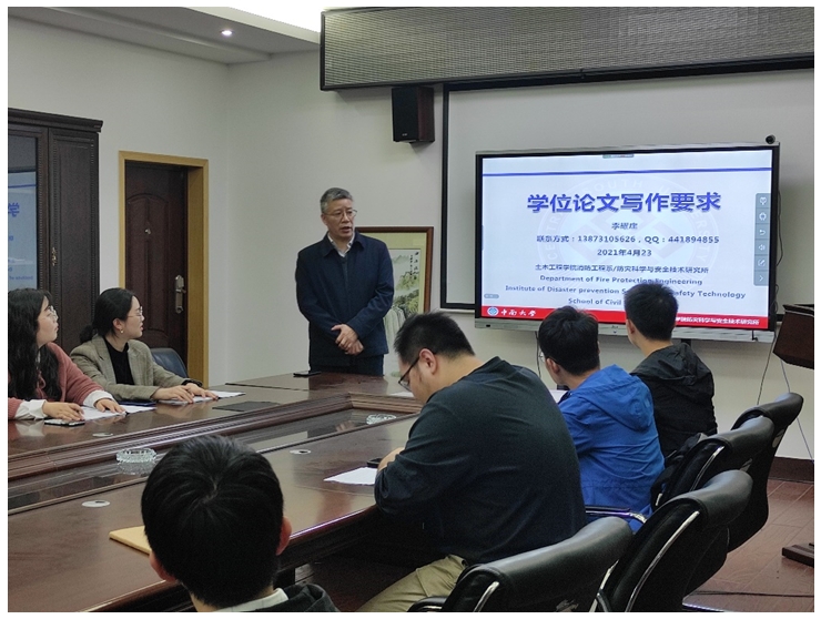 2021年4月22日19点,值此2021届毕业生申请学位答辩之际,中南大学消防工程系特邀李耀庄教授进行学位论文格式规范报告,报告地点位于中南大学铁道学院第一综合实验楼。本次报告会由消防工程系教职工党支部、学生党支部联合策划,消防科学青年社组织承办,特邀消防工程系李耀庄教授、新葡的京集团35222vip辅导员、研防灾党支部书记杨涛老师,消防工程系王峥阳老师出席报告会,其他参与人员有消防工程系2021届毕业生及其他土木类学生。消防科学青年社主席、消防工程系2019级博士研究生赵家明主持报告会。