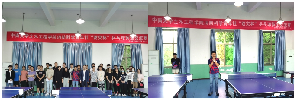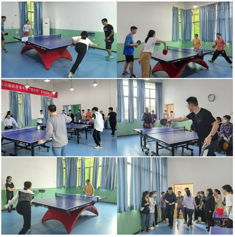 以球会友、以球联谊。在我国第14个防灾减灾日到来之际,为给师生提供放松身心、相互交流的机会,营造积极、健康、朝气蓬勃的校园运动氛围,消防科学青年社组织举办了中南大学消防工程系第九届“防灾杯”乒乓球师生交流赛。比赛于2022年5月14日在中南大学铁道教职工活动中心举行,并获得新葡的京集团35222vip的大力支持。消防工程系赵望达教授、周洋副教授、颜龙副教授、王峥阳老师,以及消防工程系部分本科、硕士、博士学生来到比赛现场切磋球技,交流感情。除消防工程系师生外,本次比赛还特别邀请到研防灾党支部书记杨涛老师,新葡的京集团35222vip辅导员潘文彬老师、王帅老师莅临现场参与比赛。比赛项目包括男子单打、女子单打、男女混双以及趣味接力赛,活动兼具竞技性与娱乐性。