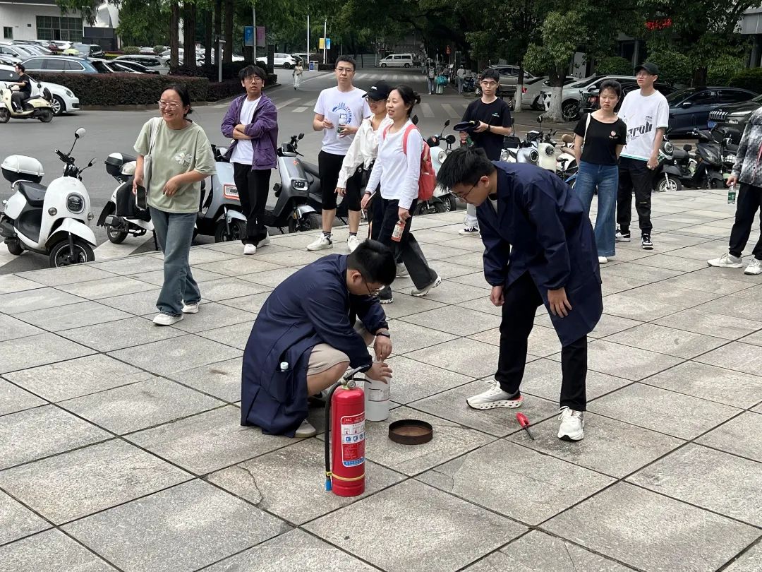 最后,在灭火器实操环节中,研究生张帅、毕永康、王鑫喜讲解了灭火器使用规范,并指导同学们亲手操作灭火器,完成灭火实战演练。通过实操教学,同学们掌握了灭火器操作技巧,增强了应对火情的自救能力。