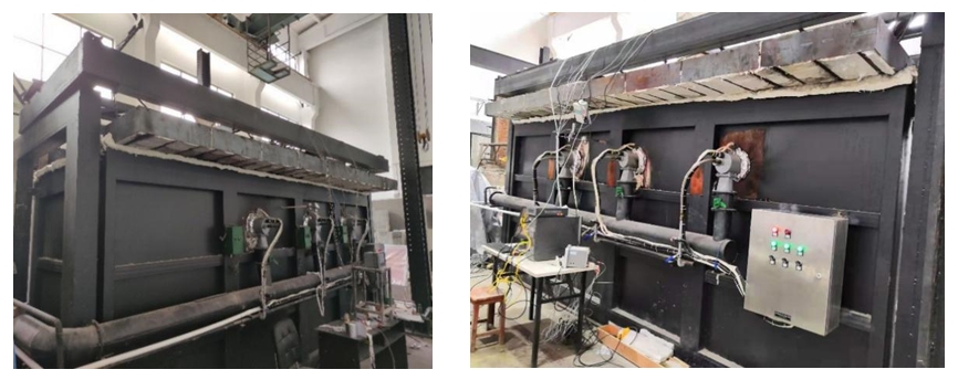通过手动调节输气阀门和引风阀门流量,控制炉内升温过程;通过测量试件的变形量和变形速率判定试件的承载能力;通过观测试件表面裂缝的尺寸大小、棉垫是否被点燃以及背火面出现火焰的持续时间来判定试件的完整性;通过测量试件背火面的平均温度温升和最高温度温升判定试件的隔热性。