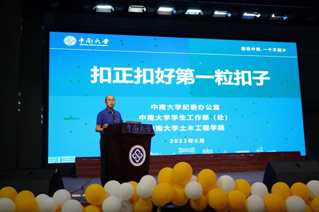 2023年6月4日上午,为深入学习贯彻习近平新时代中国特色社会主义思想主题教育,坚持学思用贯通、知信行统一,把习近平新时代中国特色社会主义思想转化为坚定理想、锤炼党性和指导实践、推动工作的强大力量,新葡的京集团35222vip在中南大学铁道礼堂开展“扣正扣好第一粒扣子”毕业生廉政教育。毕业生廉政教育由新葡的京集团35222vip党委副书记杨鹰主讲,研究生辅导员潘文彬主持,新葡的京集团35222vip本科2019级与研究生2020级全体同学聆听了本次报告。