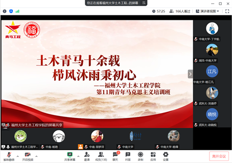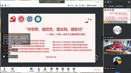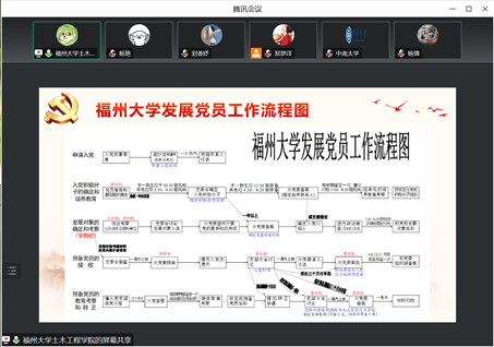 新葡的京集团35222vip2021级辅导员、研材料硕士党支部书记杨倩,桥梁系青年教师、研桥梁第四党支部书记周浩,研桥梁第二党支部书记郑梦洋;福州大学新葡的京集团35222vip2021级研究生辅导员、研究生第五党支部书记黄哲,2022级研究生辅导员、研究生第四党支部书记李彬彬,2019级本科生辅导员、中加班党支部书记童莹芳,青马班党支部班长祁湘平、董靖怡;武汉科技大学城市建设学院研究生结构方向、暖通方向党支部书记赵晓悦、刘香妤及各支部全体党员参会,会上进行了主题教育理论学习与党支部建设经验交流。