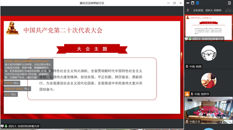 刘香妤就《学习贯彻中国共产党第二十次全国代表大会报告》进行了学习分享,从党的二十大的议程和主题、党的二十大报告重点、党的二十大金句三个方面进行了讲解。刘香妤结合视频等形式对二十大报告进行了详细讲解,同时,指出各支部应利用好学习强国、共产党员网等平台,组织支部党员系统学习习近平新时代中国特色社会主义思想,深入学习党的创新理论和方针政策,不断提高政治理论水平和实践能力,提升支部党员党性修养,增强责任感和使命感。