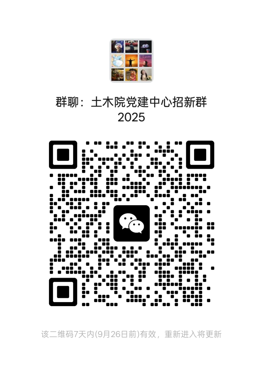 9月19日--9月23日,请个人报名人员填写《新葡的京集团35222vip学生党建中心报名表》(附件1),于9月23日中午12:00前将申请表发送至邮箱liuyemy@163.com,文件命名为“党建中心招新+姓名+意向部门”。请报名同学加入2025年土木院学生党建中心招新微信群,相关事项后续会在群内通知。