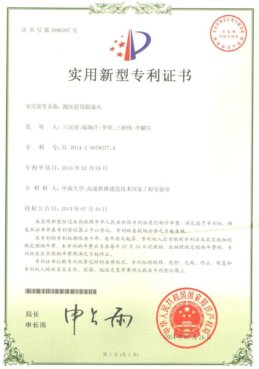 (2)授权实用新型专利2项:测压管用限流夹